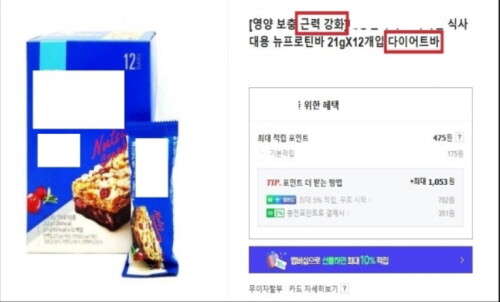 세부적으로 ▲체지방 감소 다이어트바 ▲근력 강화 다이어트바 ▲다이어트 헬스 영양간식 ▲살 안찌는 과자 ▲체중감소 지원 등과 같이 일반식품인 프로틴바를 다이어트를 위한 건강기능식품으로 소비자가 오인‧혼동하도록 광고했다.