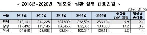 | ▲최근 5년간 ‘탈모증’ 질환 성별 진료인원 (표= 국민건강보험공단 제공) |