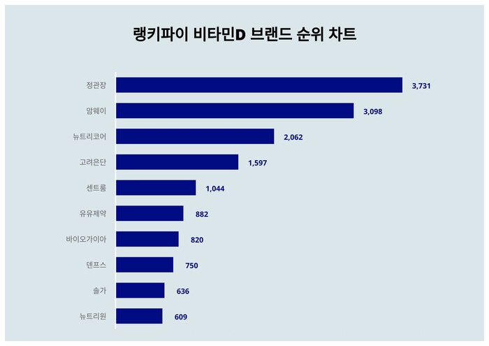 3731포인트를 받은 정관장이 비타민D 브랜드 트렌드지수 1위에 올랐다. 이어 2위는 3098포인트가 나온 암웨이이다.