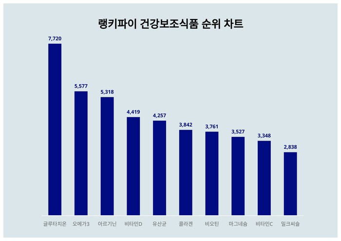 4위는 비타민D, 5위 유산균, 6위 콜라겐, 7위 비오틴, 8위 마그네슘, 9위 비타민C, 10위 밀크씨슬 순이다.