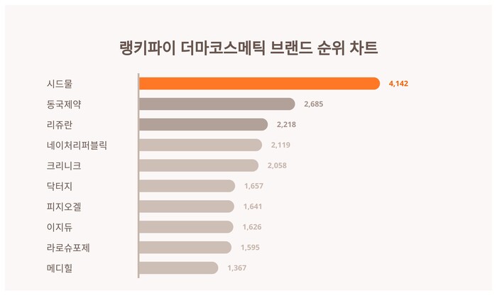 [mdtoday=정민주 기자] 빅데이터 프로그램을 갖춘 랭키파이가 7월 5주차 기준 더마코스메틱 브랜드 부문 트렌드지수를 분석한 결과 시드물이 1위로 집계됐다고 5일 밝혔다.