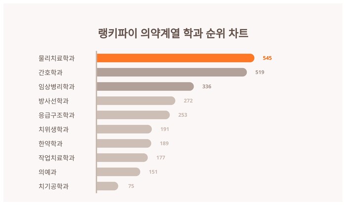 545포인트를 받은 물리치료학과가 의약계열 학과 트렌드지수 1위에 올랐다. 이어 2위는 519포인트가 나온 간호학과이다.