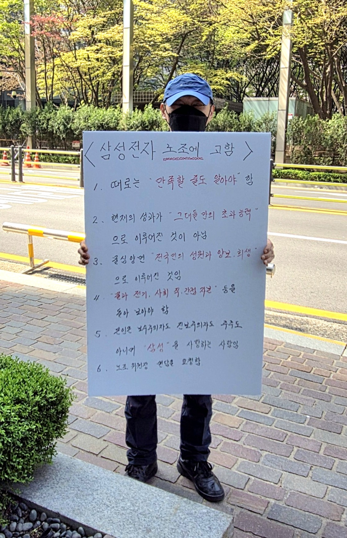 삼성전자 노조가 5월 대규모 파업을 예고하면서 노사 갈등은 국민적 관심사로 떠올랐다. 지난 15일에는 서울 서초구 삼성전자 사옥 앞에서 노조를 비판하는 1인 시위가 벌어지기도 했다. 당시 시위자는 ‘삼성전자 노조에 고함’이라는 피켓을 통해 노조의 행보를 비판했다.