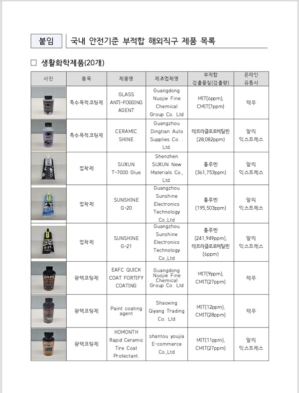안전성 조사를 실시한 558개 제품은 ▲방향제, 코팅제 등 생활화학제품 143개 ▲귀걸이, 목걸이 등 금속장신구 415개로, 이 중 69개 제품(생활화학제품 20개, 금속장신구 49개)이 ‘생활화학제품 및 살생물제의 안전관리에 관한 법률’, '화학물질등록평가법’ 등 국내 안전기준에 적합하지 않은 것으로 확인됐다.