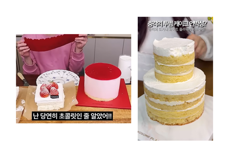 | ▲ 띠지 케이크로 논란이 됐던 투썸의 피스타치오 딸기 무스(왼쪽), 화이트 플라워 케이크 (사진=유튜브 캡처) |