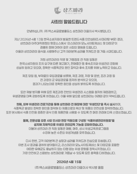 박시병 대표는 “지난 13일 한국소비자원이 발표한 트렌드식품 안전실태조사(마라탕 부문) 결과, 상츠마라 아주대직영점의 땅콩소스에서 리스테리아 모노사이토제네스 및 대장균이 검출된 점에 대하여 깊은 사죄의 말씀을 드린다”고 밝혔다.