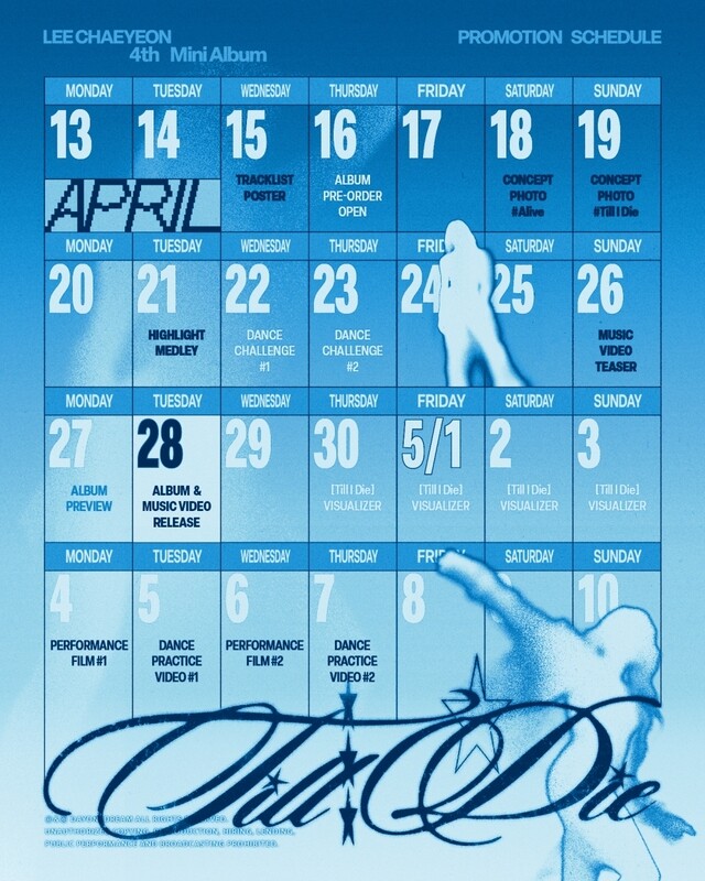 [mdtoday = 양정의 기자] 가수 이채연이 오는 28일 네 번째 미니 앨범 ‘틸 아이 다이(Till I Die)’를 발매하며 가요계 복귀를 알렸다. 소속사 데이원드림은 15일 공식 채널을 통해 이번 앨범의 프로모션 캘린더를 공개하며 본격적인 컴백 카운트다운에 돌입했다.