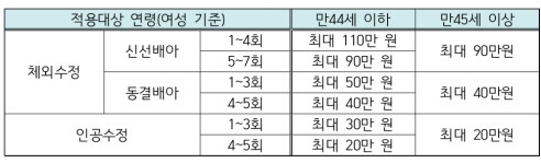 | ▲ 난임부부 시술비 지원사업 시술유형별 최대 정부지원금액 (자료=조명희 의원실, 건강보험심사평가원 제공) |