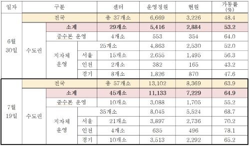 이러한 상황은 경증 환자가 이용하는 생활치료센터에서 더욱 심각한 것으로 드러났다. 수도권 생활치료센터를 살펴보면, 6월 30일 29개소(정원 5416명)에서 7월 19일 45개소(정원 1만1133명)까지 확충했음에도 가동률이 53.2%에서 64.9%로 증가했다.