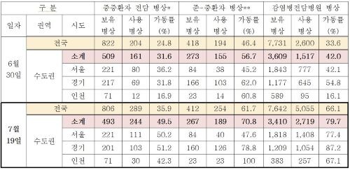 또한 감염병 전담병원은 수도권 병상 가동률이 79.7%에 육박하며, 6월 30일(42%) 대비 빠른 속도로 병상이 차고 있다.