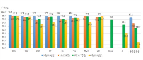 특히 만 1세 이전에 접종하는 결핵(BCG), B형간염(HepB) 백신이나 접종 횟수가 적은 수두(VAR), 홍역‧유행성이하선염‧풍진(MMR) 백신 등의 접종률이 97~98%로 높게 나타났다.