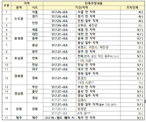 | ▲지역별 거리두기 단계 조정 현황 (사진=중앙재난안전대책본부 제공) |
