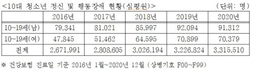 | ▲10대 청소년 정신 및 행동장애 현황 (사진=송재호 의원실 제공) |