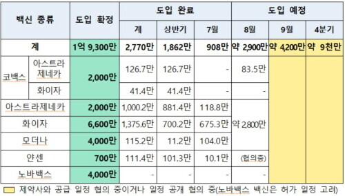 개별 계약된 백신은 ▲아스트라제네카 118.8만 회분 ▲화이자 백신 675.3만 회분 ▲모더나 백신 104만 회분 ▲얀센 백신 10.1만 회분 등이다.