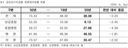 급성상기도감염 항생제 처방률은 36.06%로 전년도 38.30% 대비 2.24%p 감소했다. 종별로는 상급종합 8.13%, 종합병원 27.66%, 병원 46.55%, 의원 35.47% 순 이었다. 종합병원의 경우 전년 대비 가장 크게 감소한 것으로 나타났다.