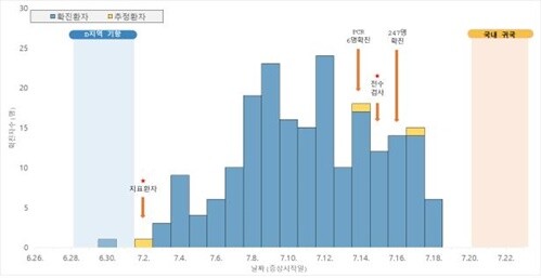 청해부대 34진 부대원 중 코로나19 의심증상자가 7월 2일 최초 인지된 후, 7월 14일~15일 국외에서 실시한 코로나19 진단검사 (PCR)에서 양성자가 다수 발생함에 따라 7월 20일 부대원 301명을 전원 귀국 조치했다.