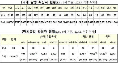 중앙방역대책본부는 11일 0시 기준 국내 발생 신규 확진자 2145명, 해외유입 사례 78명 등 신규 확진자 총 2223명이 확인돼 총 누적 확진자 수는 21만6206명(해외유입 1만2552명)이라고 밝혔다.