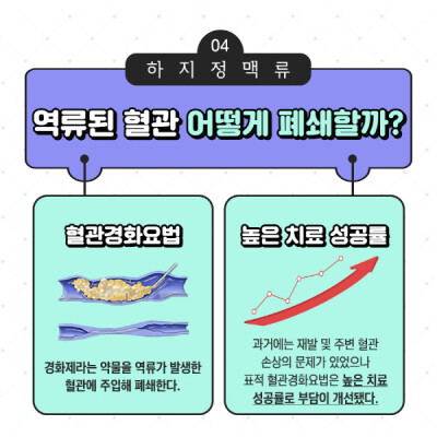 그렇다면 비수술 치료는 어떻게 이뤄질까? 일반적으로 압박스타킹을 떠올리지만 역류가 발생한 만큼 폐쇄를 시행해야 하므로 ‘혈관경화요법’이 주로 활용된다. 이 치료는 경화제라는 약물을 역류가 발생한 혈관에 투여하여 폐쇄하는 것이다.