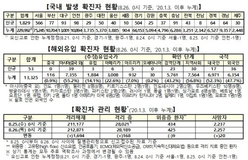 중앙방역대책본부는 26일 0시 기준으로, 국내 발생 신규 확진자는 1829명, 해외유입 사례는 53명이 확인되어 1882명 늘어 총 누적 확진자 수는 24만3317명(해외유입 1만3325명)이라고 밝혔다.