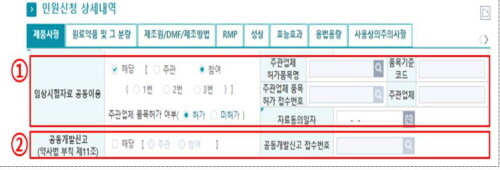 임상시험 자료 공동이용 항목은 임상시험 자료를 공동으로 이용한 품목의 경우 작성하며 신청 업체의 임상시험 주관 또는 참여 등 역할을 입력하고, 주관 업체 품목의 허가 또는 허가 신청 정보(접수번호 등)도 입력해야 한다.