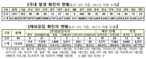 중앙방역대책본부는 27일 0시 기준 국내 발생 신규 확진자는 1811명, 해외유입 사례는 30명이 확인되어 총 누적 확진자 수는 24만5158명(해외유입 1만3355명)이라고 밝혔다.
