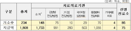 치료의료기관(148개소) 개산급 1733억 원 중 치료병상 확보에 따른 보상이 1684억 원(97.2%)이며, 코로나19 환자 치료로 인한 일반환자 진료비 감소 보상은 44억 원(2.5%) 등이다.