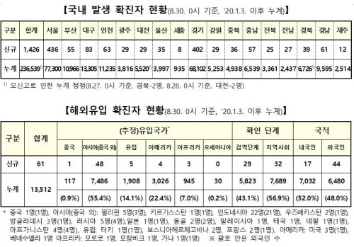 중앙방역대책본부는 30일 0시 기준으로 국내 발생 신규 확진자는 1426명, 해외유입 사례는 61명이 확인되어 총 누적 확진자 수는 25만51명(해외유입 1만3512명)이라고 밝혔다.
