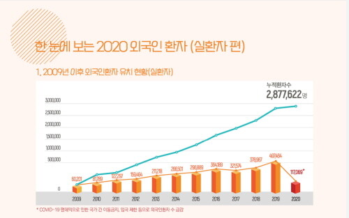 연도별로 살펴보면 2009년부터 외국인 환자 수는 연평균 6.2%의 꾸준한 증가세를 보이다 2019년 역대 최고치를 기록했지만 지난해 코로나19 팬데믹에 따른 국가 간 이동금지, 입국 제한 등으로 인해 환자 수가 급감한 것으로 분석된다.