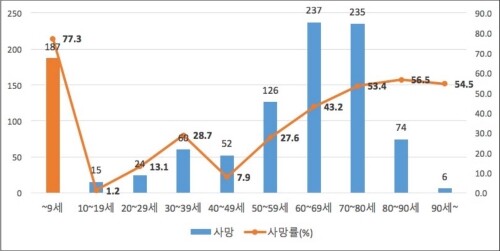이어 70세 이상부터는 50% 대의 사망률을 기록했으며, ▲60대 43.2% ▲30대 28.7% ▲50대 27.6% ▲20대 13.1% ▲40대 7.9% 순으로 집계돼 영유아 다음으로 60세 이상 고령층의 사망률이 높았다.