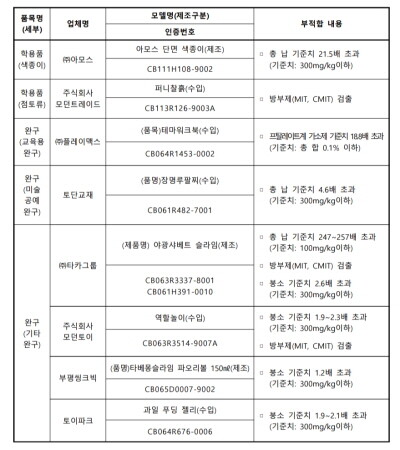 놀이학습용 제품인 플레이맥스의 ‘테마워크북’에서는 간, 신장 등에 좋지 않은 프탈레이트계 가소제가 기준치(총합의 0.1%이하)를 넘었고, 토단교재의 팔찌류 미술공예 1개 제품은 납이 기준치(300mg/kg)를 상회했다.