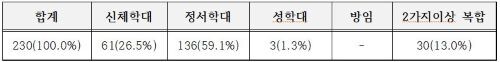 학대 유형을 보면 전체 230명 중 정서학대가 136명으로 가장 많았고, 신체학대가 61명, 성 학대도 3건이나 발생한 것으로 나타났다.