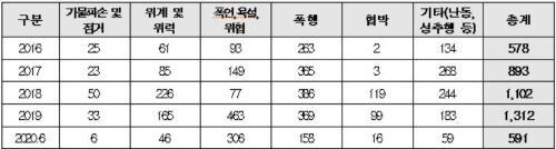 방해 행위 유형별로는 2019년 기준 폭언·욕설·위협이 463건으로 가장 많았고, 폭행이 369건으로 그 뒤를 이었으며, ▲기물파손·점거 33건 ▲위계·위력 165건 ▲협박 99건 ▲기타(난동·성추행 등) 183건 등으로 조사됐다.