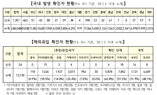 의심신고 검사자 수는 3만4010명, 수도권 임시선별검사소 검사 건수는 4만2951건(확진자 234명), 비수도권 임시선별검사소 검사 건수는 1만3946건(확진자 59명)으로 총 검사 건수는 9만907건이다.