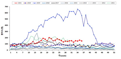 15일 질병관리청에 따르면 2021년 11주(3월 7~13일) 이후 주당 100명 이상의 환자가 지속적으로 신고되면서 전년 동기간과 비교해 2배 이상의 환자가 신고됐고 특히 30주(7월 18~24일) 이후부터는 2019년 대규모 유행을 제외하고는 2011년 이후 가장 많은 환자가 보고되고 있다.