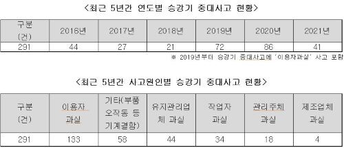 국민의힘 김형동 의원이 승강기안전공단으로부터 제출받은 자료에 따르면 최근 5년간 승강기 중대사고는 291건으로 집계됐다.