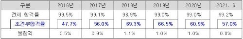 검사를 제대로 통과하지 못한 승강기가 운행되고 있는 것도 문제다. 승강기안전공단은 승강기 점검결과를 ▲합격 ▲조건부 합격 ▲불합격 등으로 구분하는데, 2016년 합격 승강기의 조건부합격 비율은 2016년 47.7%에서 2020년 60.9%로 매년 증가하고 있으며, 올해 상반기에도 전체 합격 승강기의 56.5%는 조건부합격을 받은 것으로 나타났다.