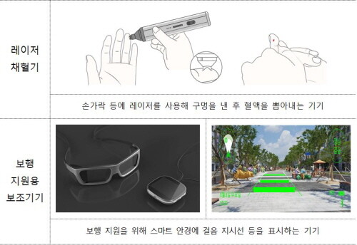 특히 이번에 품목 분류가 신설되는 레이저 채혈기는 당뇨병 환자가 혈당 측정 시 바늘이 아닌 레이저를 이용하여 구멍을 내도록 하는 제품이며, 보행지원용 보조기기는 운동 장애가 있는 환자의 보행을 분석해 걸음 지시선 등을 안내하여 보행에 도움을 줄 수 있도록 기능을 갖춘 스마트 안경이다.