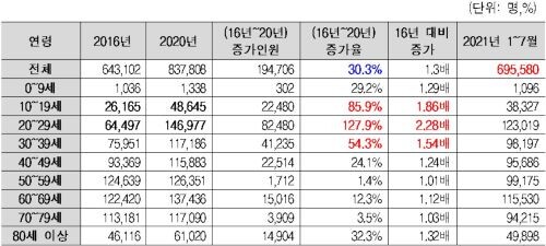 이 가운데 우울증 환자가 가장 많은 연령대는 20대로 2016년 6만4497명에서 2020년 14만6977명으로 2.28배 늘어났으며, 10대 우울증 환자도 2016년 2만6165명에서 지난해 4만8645명을 기록하며 2배 가까이 증가했다.