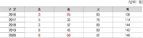 학교급별 학생 자살자 수를 살펴보면 자살자 수는 5년 내내 고등학생이 가장 많은 것으로 나타난 반면, 초등학생은 2016년 3명에서 2020년 6명으로, 중학생은 2016년 25명에서 2020년 50명으로 5년 전보다 2배씩 증가한 것으로 나타났다.