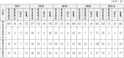 이 중 의사는 ▲2017년 752명 ▲2018년 743명 ▲2019년 496명 ▲2020년 563명 ▲2021년 6월까지 358명 순으로 조사돼 매년 수 백여 명의 의사가 행정처분을 받고 있는 것으로 드러났다.