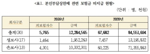 국회 정무위원회 소속 정의당 배진교 의원이 금융감독원으로부터 제출받은 자료에 따르면 보험사가 본인부담상한제를 이유로 보험가입자에게 보험금을 미지급한 명수가 2016년 5765명에서 2020년 6만7682명으로 11.7배 상승했고 작년 한 해 미지급 금액은 845억 원에 달했다.